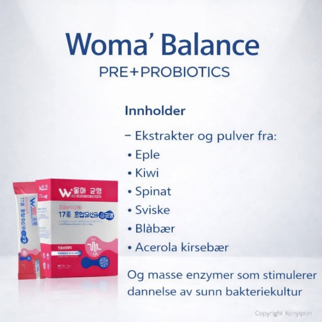 Spesielt egnet for å fremme kvinners helse i tarmen og underlivet. Stimulerer gode mikroorganismer og Ph, fjerner eventuell ubehagelig lukt fra underlivet. Bidrar også til å stimulere fordøyelsessystemet. Reduserer også forstoppelse, samt styrker immunforsvaret. Et unikt produkt fra Sør-Korea er kommet til butikken.