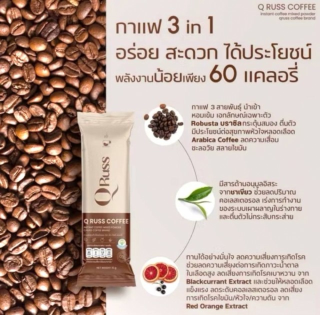 QRuss Coffee Plus 30 poser/pakke (450 gram). Deilig og fyldig som bidrar til vektkontroll takket være ingrediensene av ekstrakter.