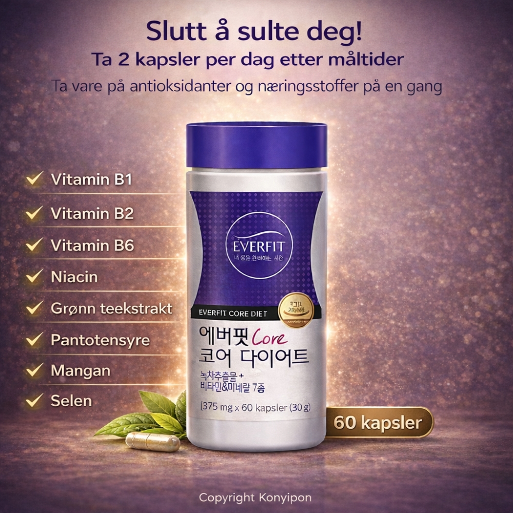 Everfit Core Diet kapsler er et helsefunksjonelt kosttilskudd utviklet for å hjelpe med vektkontroll og reduksjon av kroppsfett. Den inneholder grønn te-ekstrakt, som er en kilde til katekiner, kjent for sine antioksidantegenskaper og potensial til å øke stoffskiftet og fettforbrenningen.