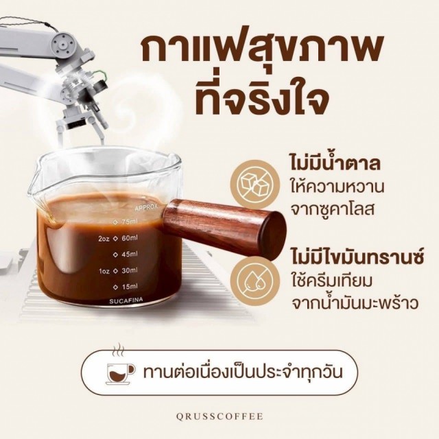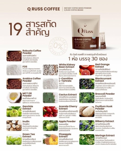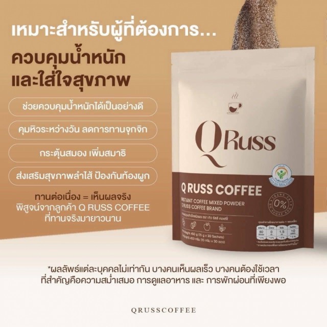 QRuss Coffee Plus 30 poser/pakke (450 gram). Deilig og fyldig som bidrar til vektkontroll takket være ingrediensene av ekstrakter.